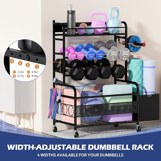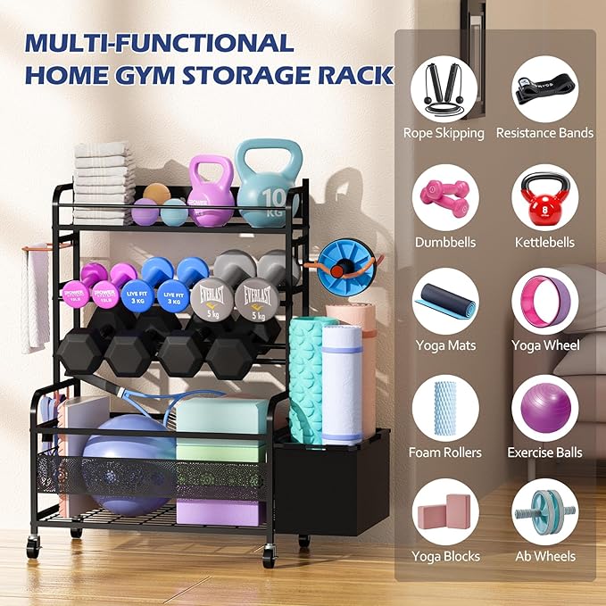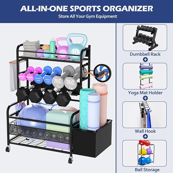 Weight Rack for Dumbbells, Home Gym Storage for Dumbbells Yoga Mat Kettlebells and Balls, All in One Workout Equipment Storage with Wheels and Hooks