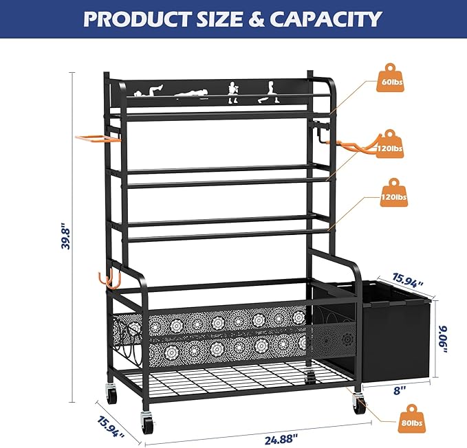 - Large Capacity Home Gym Storage Rack: This all-in-one workout equipment storage rack is equipped with a metal mesh top layer, 2 layers of adjustable width weight racks, a bottom storage basket, a side hanging basket, 4 hanging hooks and 1 square hook, which is a convenient and ideal option for displacing your dumbbell rack, yoga mat holder, ball basket and wall hook. The dimension of this sports equipment organizer is 24.88”(W) x 15.94”(D) x 39.8”(H)