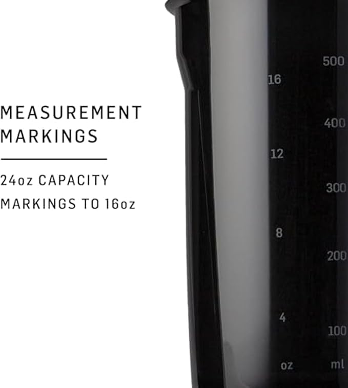 - 24-ounce capacity (note: measurements only go to 16 ounces) sleek and durable shaker cup offers plenty of room for supplements, meal replacements, or water