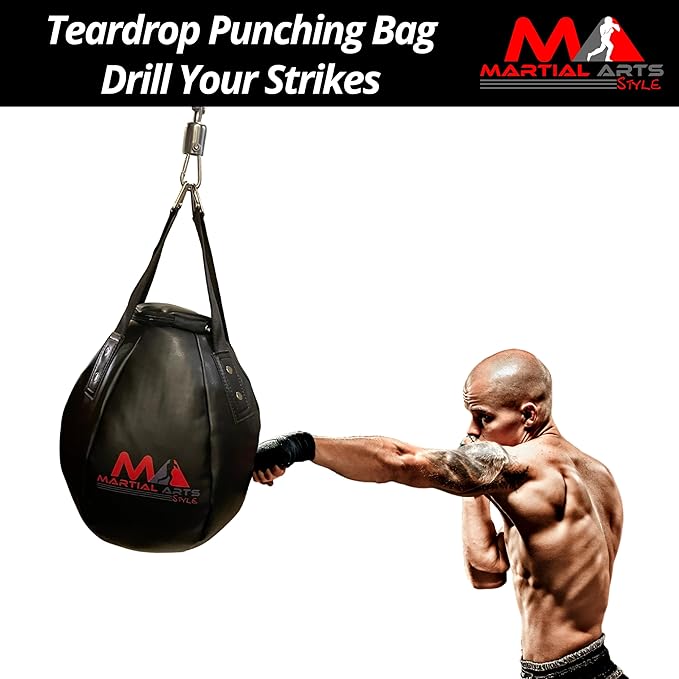 - BUILT FOR PERFORMANCE - This teardrop punching bag will enable you to work on a large variety of punches and combinations with different angles such as jabs, hook punches, uppercut punches and / or body shot punches because of its ball shape. It will swing and rotate perfectly at the impact of your shots and will let you incorporate bobbing and weaving movements with your strikes.