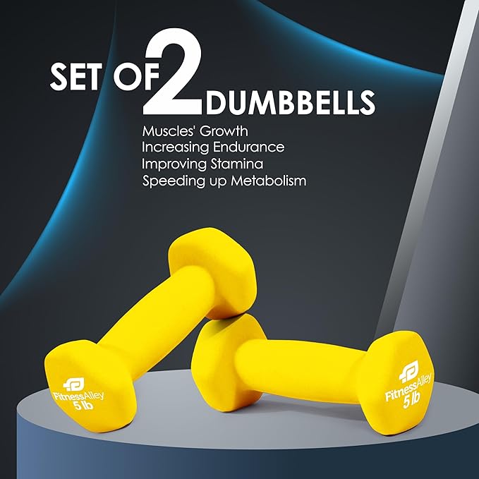 - The box includes 2 Dumbbells that comes in 5LB Size and yellow Color. Construction is of cast iron, which is of superior quality along with neoprene gripping that allows lifting of heavyweights simpler and easier