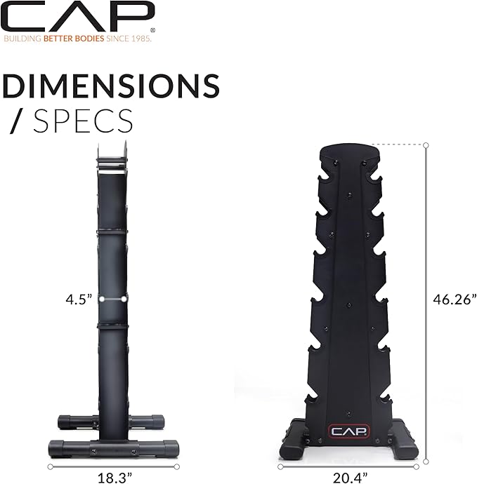 - DURABLE AND RELIABLE – Rack is made with steel and finished with durable black powder coat. Heads are made from ASTM A48 Class 20 grey iron and joined together by a 1018 cold rolled solid steel handle (sizes 15-120lb) with an extreme durable rubber coating.