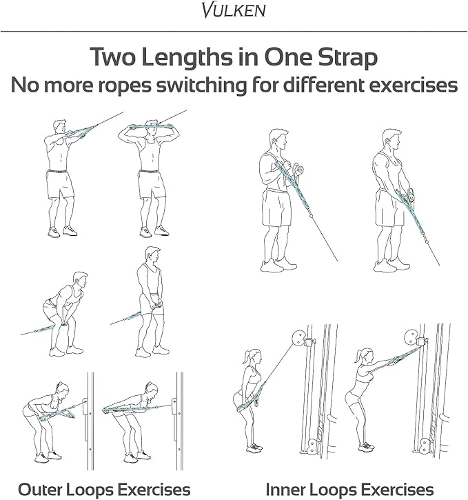 - One Triceps Rope for Diversified Exercises: No need to switch between multiple triceps ropes of different sizes for various exercises anymore. With the Vulken triceps strap, you can handle it all with just one rope. Its two-lengths-in-one design provides great versatility to your workout routine by allowing you to easily switch lengths between different rope exercises such as face pulls, triceps pushdowns, bicep curls, and more cable attachment exercises.