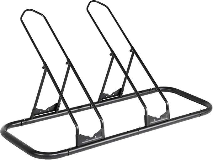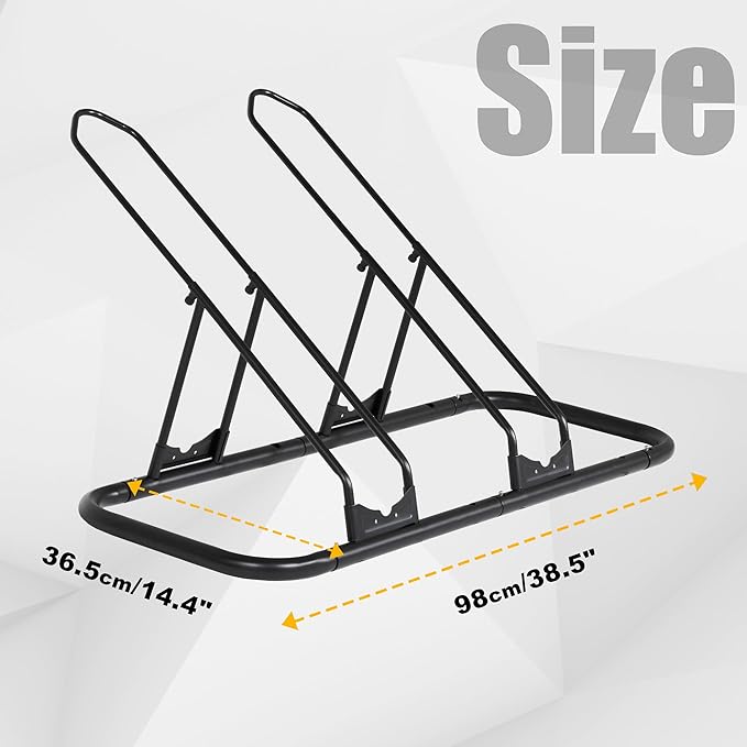 - DURABLE & RELIABLE - Crafted from high-quality steel and coated with a durable black finish, this parking rack ensures a secure hold on your bikes with its robust design, offering a solid and reliable solution for bike storage. The front and back plate holding system prevents the upholder from widening, as a broad holder could impact the stability of bike storage. The dimensions of a 2-fat-bike rack are 98cm/38.5" in length and 36.5cm/14.4" in width. Unique Patented Design, PAT 18/513,639.