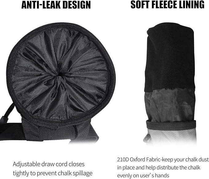 - 【STURDY AND DURABLE CHALK POUCH】The 420D Oxford fabric used on the outside of the chalk pouch is not only very resistant to wear and tear, but also very easy to clean. The inner lining is made of very soft fleece lining and 210D Oxford cloth, which keeps the chalk powder in place and helps to spread the chalk evenly on the user's hand.