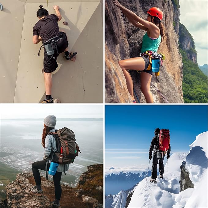 - 【LARGE CAPACITY】The chalk bag is large enough to hold three chalk bags and wide enough to accommodate large hands. There is also a zippered pocket on the back of the chalk bag to store your cell phone, keys, credit card/ID ect. The brush clip on the side of the chalk bag can hold a rock brush or other small accessories. There is also a carabiner strap for quick attachment to a carabiner or quick pull.