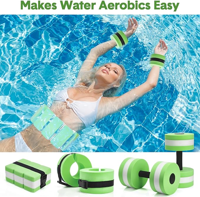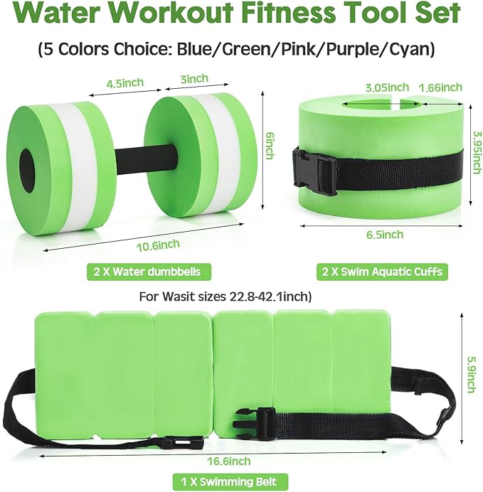 - Complete Package for Water Fitness: this water dumbbell set is a comprehensive package for your water workout regime, including 2 foam swim aquatic cuffs, 2 lightweight aquatic exercise dumbbells, and 1 swim belt, which ensures a full body workout, improving your overall fitness