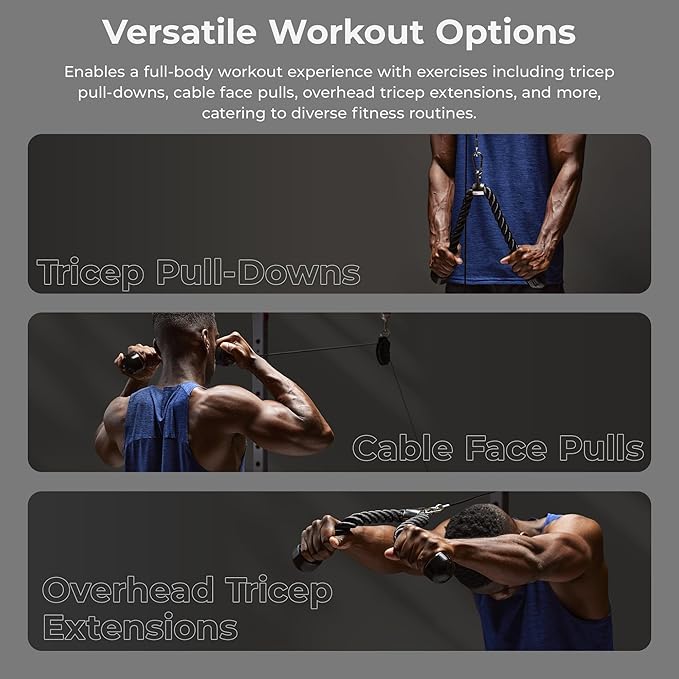 - 【VERSATILE WORKOUT OPTIONS】Enables a full-body workout experience with exercises including tricep pull-downs, facial lifts, rope hammer curls, overhead tricep extensions, sit-ups, and more, catering to diverse fitness routines.