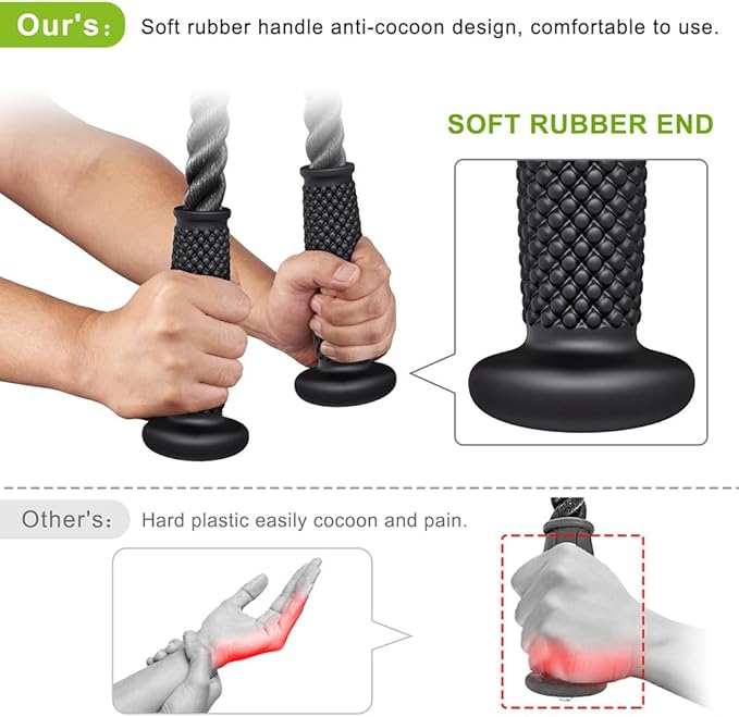 - 【28" Tricep Rope】This 28-inch rope is made of heavy-duty nylon that can withstand up to 900 lbs of tension. It also has soft rubber blocks at the ends that prevent your hands from slipping and protect your skin. You can use this rope for tricep extensions, face pulls, hammer curls, and more.