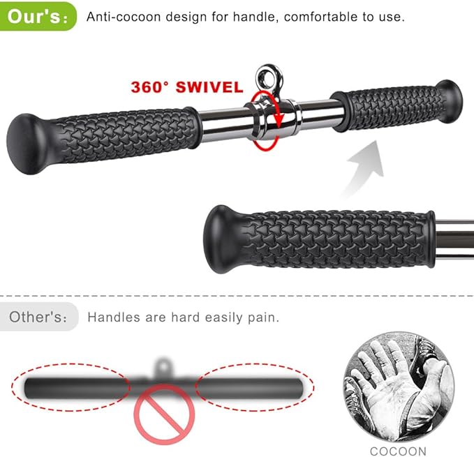 - 【18" Rotating Straight Bar】This 18-inch bar features a 360-degree swivel that allows you to adjust the angle and direction of your movements. It also has non-slip rubber handles that provide a comfortable and secure grip. Ideal for pulldown, curl, row, and press movements.