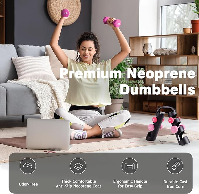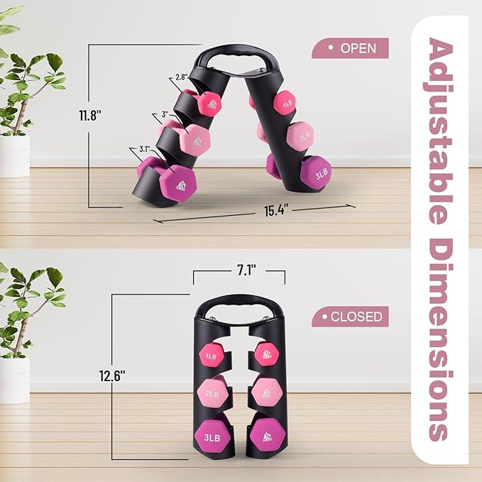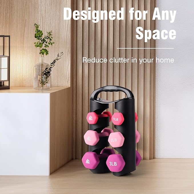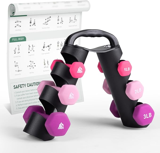 - Practical Gift for You & Your Family: Set includes pairs of 1lb, 2lb, 3lb neoprene coated hex dumbbells with a unique dumbbell rack for storage, which is perfect for physical therapy and daily workout. Light bright color and soft touching feel will please everyone. It also comes with a poster to help plan your workout.