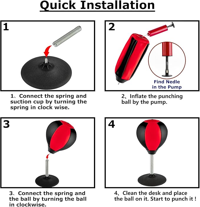 - 【EASY INSTALLATION】The stress buster is very easy to install. It also comes with an air pump so not much effort is needed to inflate the punching ball. No screws needed to attach it to your desk or countertop since it has a suction cup as a base so you can easily stick it to any flat surface.