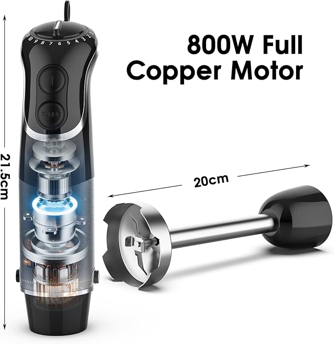 - Quiet and Powerful: This 800W copper motor handheld blender is ETL certified, ensuring safe and efficient blending and chopping. It operates quietly, making it an ideal choice for blending without disturbing your household. Its durable stainless steel body and blades provide an exceptional user experience.
