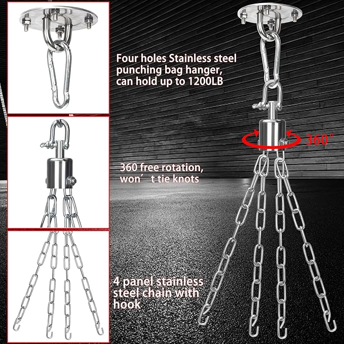 - 360° Swivel Steel-Hanger: 360° swivel Hanger allows the bag to rotate freely without knotting after impact. Equipped with 4 expansion bolts and a carabiner, easy to assemble, it can hold up to 1200LB!