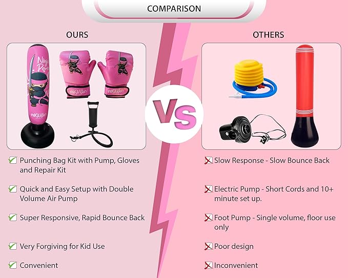 - Double Action 2X capacity Air Pump included - Inflate the kids ninja punching bag in half the time with ease. The included Dual Action Super Air Pump makes inflating fast, easy and simple in under 60 seconds. Dual Action hand pump easily inflates the inflatable punching bag on both the up and down pump unlike the issue prone electric pumps that are hindered by their short cords, the need to be near an outlet, the lack of power outlets where you need them making electric air pumps inefficient.