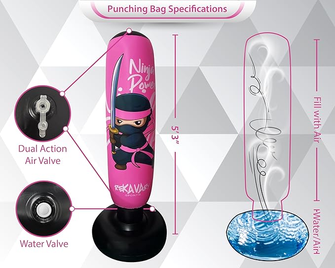 - 100% High Quality, Non-Toxic and Durable material. Kids inflatable punching bag with stand is made of extra thick, high quality, non-toxic pvc material. Each ninja toys free standing punching bag is quality tested and ensured. Rekavary sports ninja inflatable kids punching bags will stand the test of continuous kicking and punching from your kids. Boxing gloves included for an all inclusive punching boxing bag kit with ninja kids punching dummy and pump included.