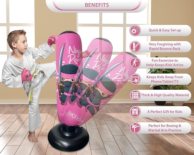- Helps keep kids physically active - Keep your kids off the couch and glued to the tv, tablet or phone. Get them moving again and help keep them active and exercising. This inflatable kids punching boxing bag is fun, enjoyable and very responsive to get your kids exercising. Get your kids active and moving. Inflatable Ninja kids punching bag will help your kids release some energy, help them build self confidence and will help develop their power and endurance.
