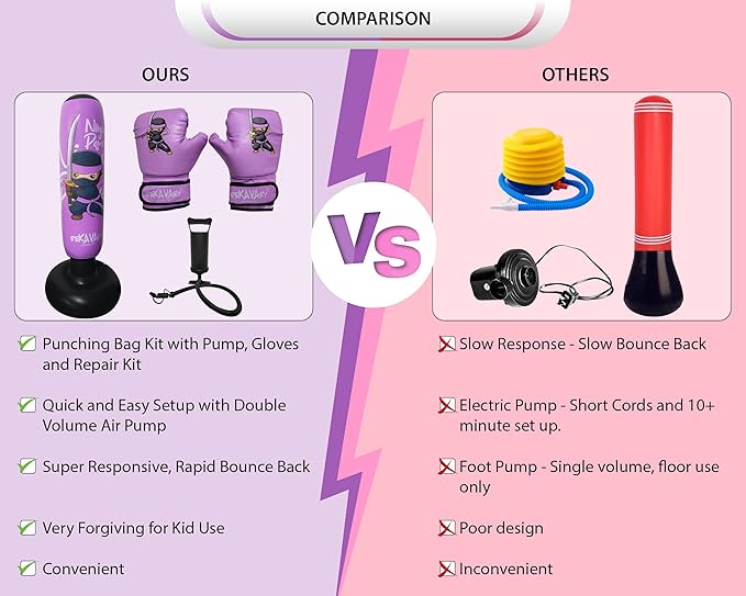 - Double Action 2X capacity Air Pump included - Inflate the kids ninja punching bag in half the time with ease. The included Dual Action Super Air Pump makes inflating fast, easy and simple in under 60 seconds. Dual Action hand pump easily inflates the inflatable punching bag on both the up and down pump unlike the issue prone electric pumps that are hindered by their short cords, the need to be near an outlet, the lack of power outlets where you need them making electric air pumps inefficient.