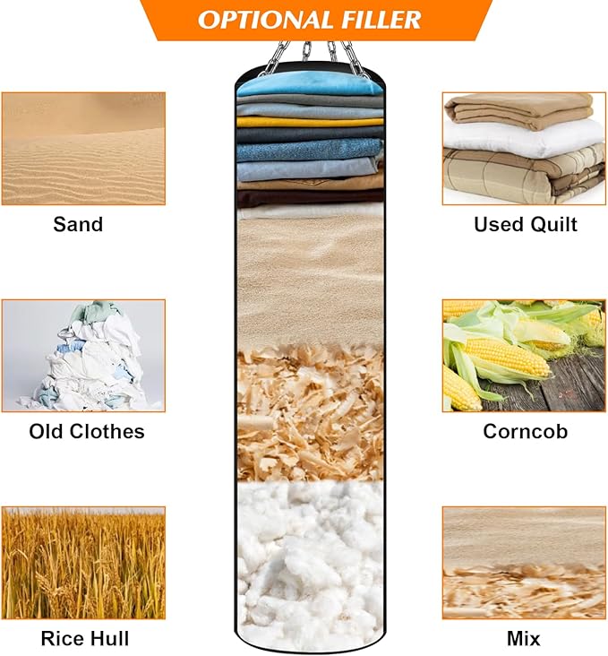 - Please Note: The hanging punching bag is empty, you can fill it up with sand, clothes, rags, foam, wood chips, sponge, sawdust, shredded cotton fabric and more. But note that in order to better protect the punching bag, make it more durable, do not only fill sand. Choose from different fillers to meet the needs of both novice and experienced boxers, filling preferably not more than 80 pounds.
