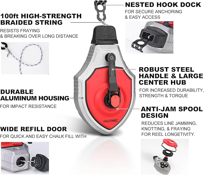 - 【Extra-Large Fill Port】: Extra-large fill port on the chalk reel enhances visibility and refilling efficiency. Nested hook design allows for compact storage and portability, and can interlock with other chalk line tools for dual use.
