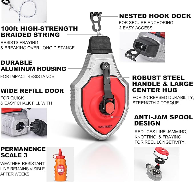 - 【Easy to Secure】: The chalk reel can be operated with one hand, and the hub lock securely holds the reel in place. The end hook slides smoothly into the storage notch, preventing it from getting caught with other items in your tool kit.