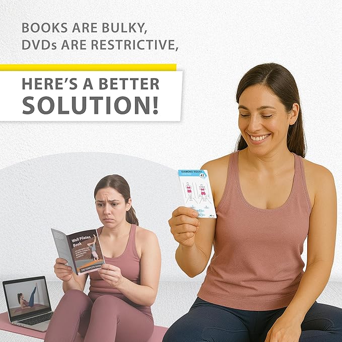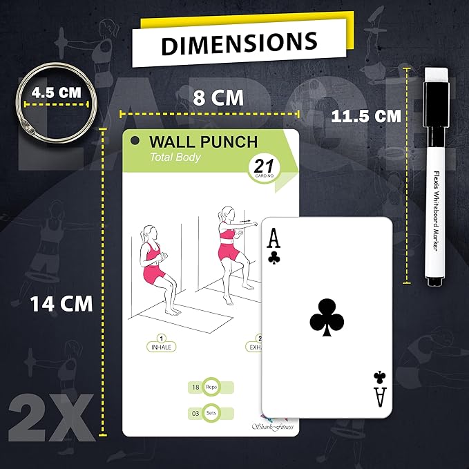 - LARGE, CLEAR & WATERPROOF - The Wall Pilates Cards : 14x8 cm are 2x the size of regular playing cards & have both Larger Text & Clear Illustrations. The Exercise Cards for Wall Yoga are made-up of sturdy plastic-like material which makes them water & dust-proof.