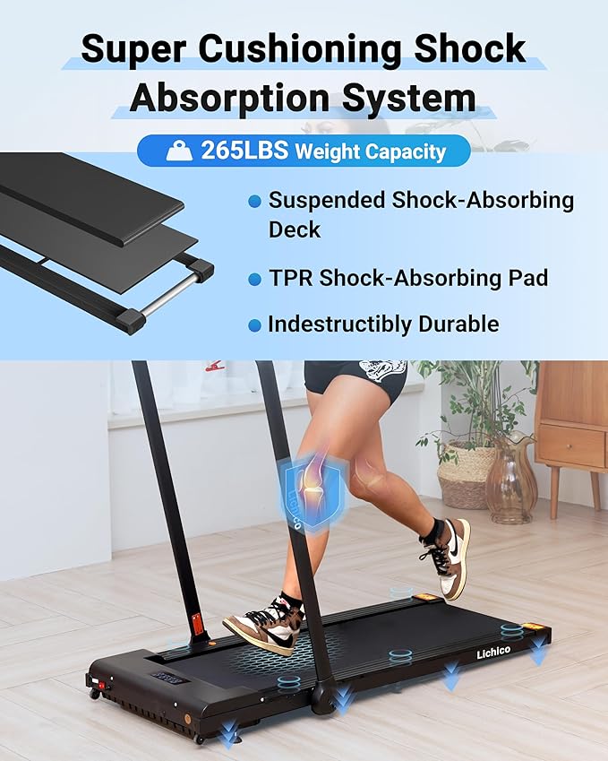 - Dual Shock Absorption: Featuring a dual shock absorption system with suspension shock plate and TRP cushioning pad, enhancing comfort and safety of the walking pad treadmill, effectively protecting knees from impact