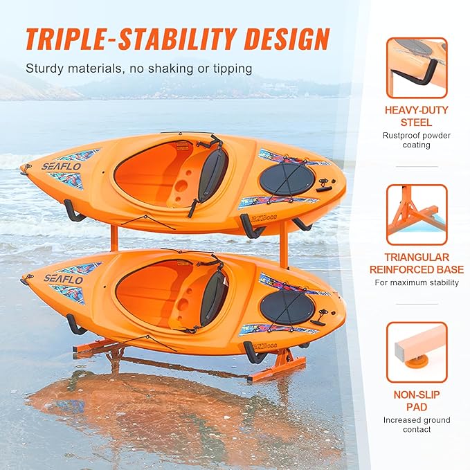 - Stable and Secure Base: The outdoor kayak storage stand base has been upgraded to a triangular structure to enhance overall stability and is equipped with non-slip rubber pads to prevent movement or tipping. This design ensures your kayak stays in place. We recommend placing the rack on flat, even ground and avoiding sandy, sloped, or uneven surfaces.