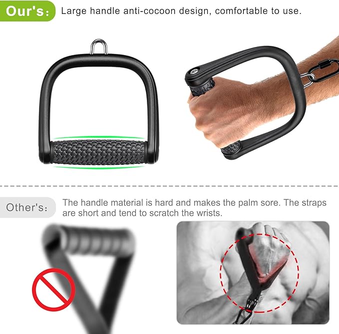 - 【Home Gym Essential】Create your own home gym with our fitness accessories. All our attachments come with heavy-duty attachments to any universal cable machine fitness system, resistance bands, weighted pulley system, and more.