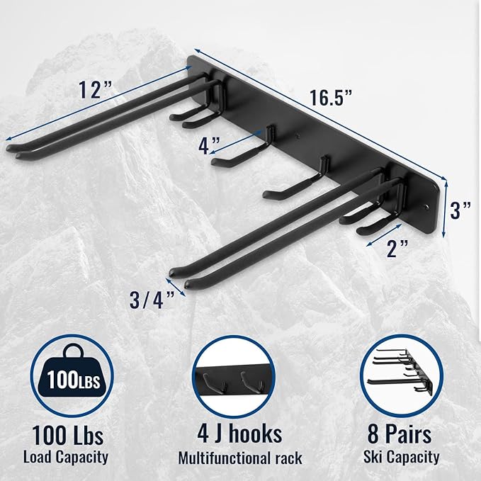 - GENEROUS HOOK SPACING: The 14-inch spacing between hooks ensures that even large skis won't touch each other, Easy to put on and take off.