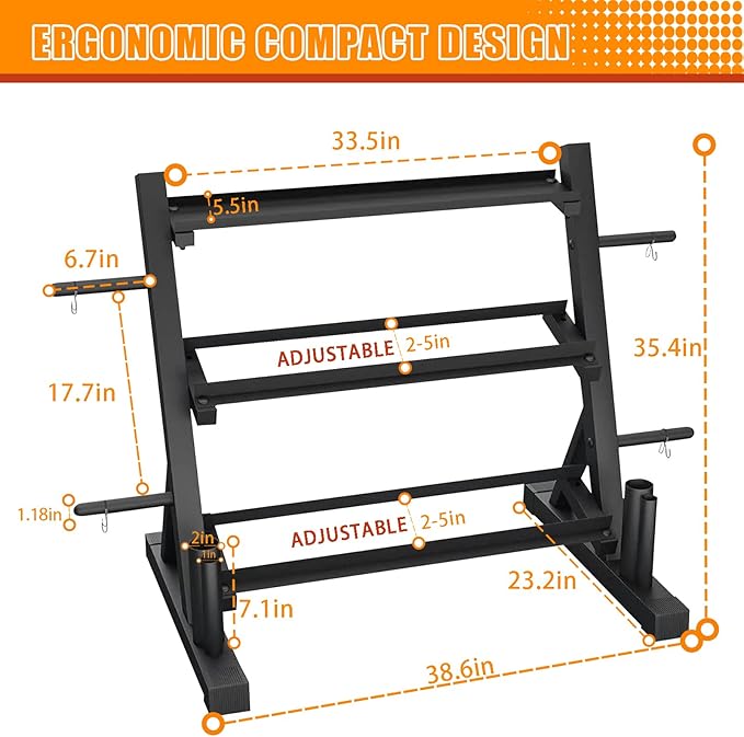 - 【Adjustable Width】Each side of every tier of this amazing weight rack for dumbbells features 2 screw holes and 1 bar width adjuster. Adjust the bar width from a snug 2" to a spacious 5" as you desire. The adjustable dumbbell stand can transform to any width you crave, making rearranging and organizing all kinds of workout equipment a breeze with the weight plate holder. It's truly excellent home gym storage.