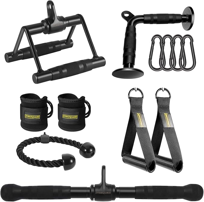 - ✅Combo includes: 1x V-Handle (Double D Handle), 1x V-Shaped Bar, 1x Straight Rotating Pull Down Bar, 1x Tricep Rope, 2x Exercise Handles, 2x Ankle Straps, 4x Black Carabiner Clips, Universal design fits most cable systems