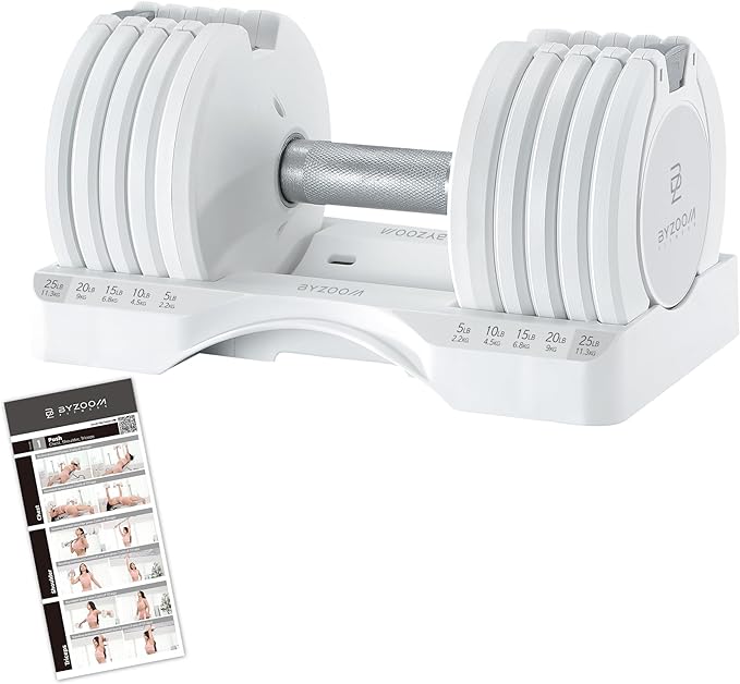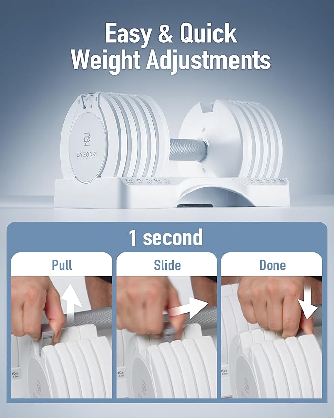 - CONVENIENT AND SPACE SAVING: Fixed length on adjustable dumbbells is never a problem for BYZOOM FITNESS. The exclusive patented weight selection mechanism allows you to have an accurate weight and adjustable length.