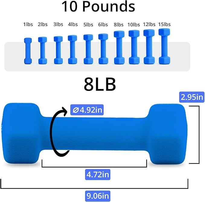 Portzon Weights Dumbbells 10 Colors Options Compatible with Set of 2 Neoprene Dumbbells Set,1-15 LB, Anti-Slip, Anti-roll, Hex Shape for Shoulder,Neck, and Hand Training for Seniors