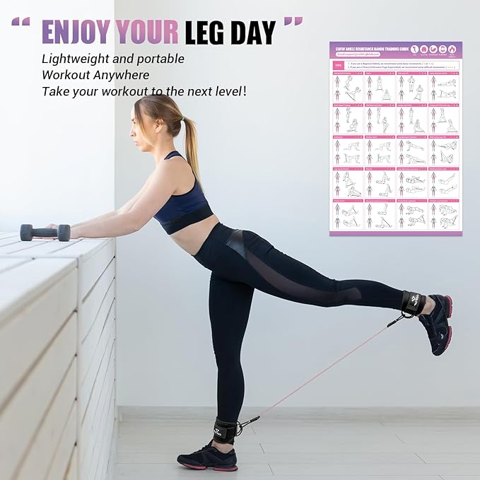 - [PORTABLE ANKLE BANDS OF CUFFS FOR WOMEN] Our ankle cuffs with resistance bands for women set weighs just 1.4 pounds and comes with a pink carrying bag, are lightweight and portable. Whether at home, in the gym, in the office, outdoors or on the go, making them the perfect addition to your gym bag. Get ready to sculpt your derriere into a work of art and become the envy of gym-goers everywhere!