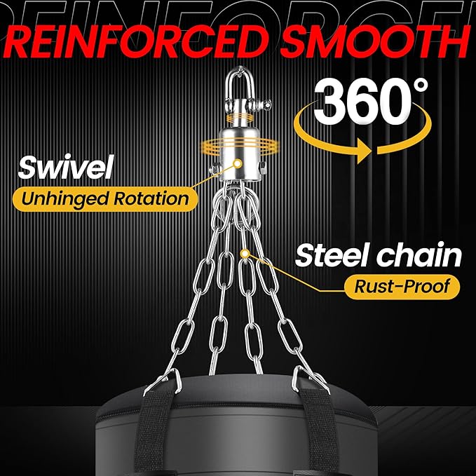 - 360° Swivel and Sturdy Hanger:Unique 360° Swivel keeps the bag rebound freely after being hit. free hanging and detachable, easy to assemble,Equipped with reinforced bag hanger, 4 expansion bolts and a carabiner, it can hold up to 1000LB! Start your boxing training!