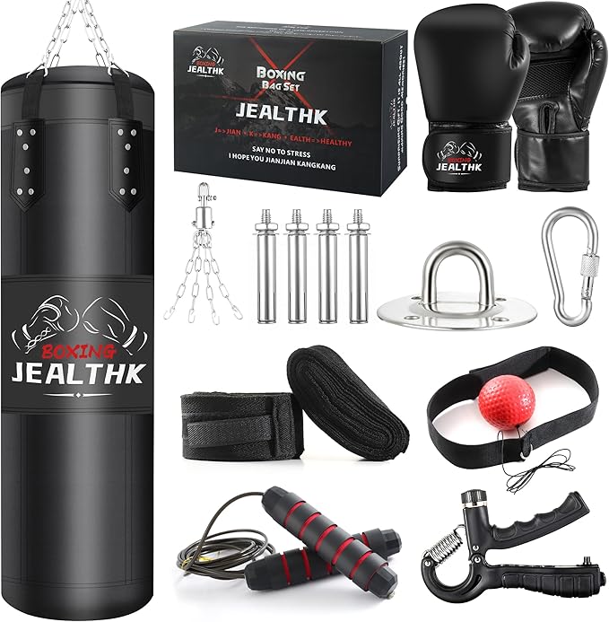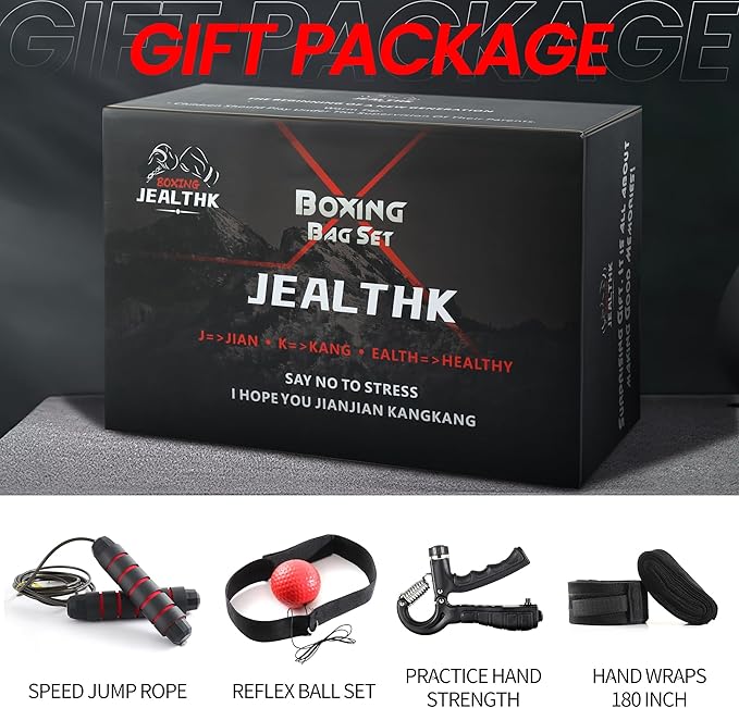 - Professional Boxing Training Equipment Set:A professional set of boxing accessories brings the ultimate experience. they contain 1 x 4ft unfilled punching bag, 1 x 12oz boxing gloves, 1 x steel chain, 1 x connecting carabiner, 1 x boxing bag hanger, 1 x jumping rope, 2x180'' Hand Wraps, 1 x counting grip strength trainer,1 x reflex ball set .4 Expansion Bolts.1 Gift Package.