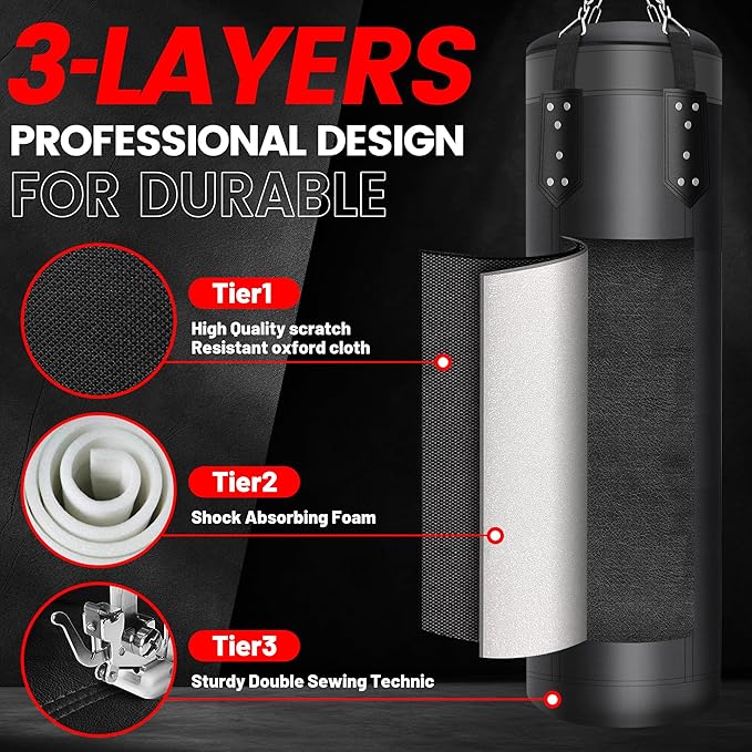 - High-density Oxford Fabric Material:Punching bag with multi-layer construction,each layer has been carefully engineered: the surface layer is made of wear-resistant thick Oxford cloth, a high-rebound shock-absorbing pearl cotton interlayer, a nylon lining, and a bottom cross-reinforced to prevent tearing, This durability ensures a more permanent boxing experience for you.