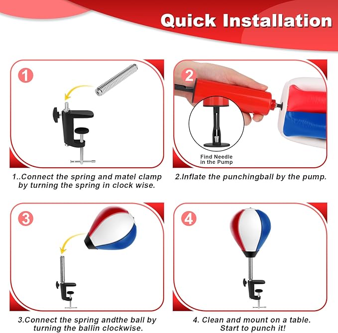 - Upgrade to a Larger Size: Desk punching bag with new upgrades! Larger ball with durable strong impact spring, sturdy matel clamp to hold firmly in place and minimise disruption, don't come off easily with constant striking. Can be clamped on tables with a thickness of 1-5.5cm/0.39-2.16 inch
