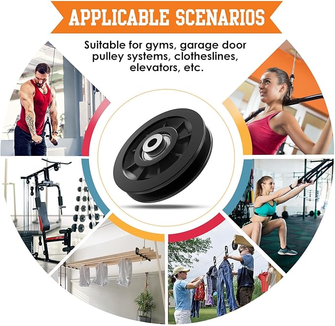 • Multiple Uses: The nylon gym pulley with bearing can be used as a replacement accessory for home gym equipment, gym tension ropes, DIY home projects, clotheslines, cable machines, garage door pulley lifting systems and more