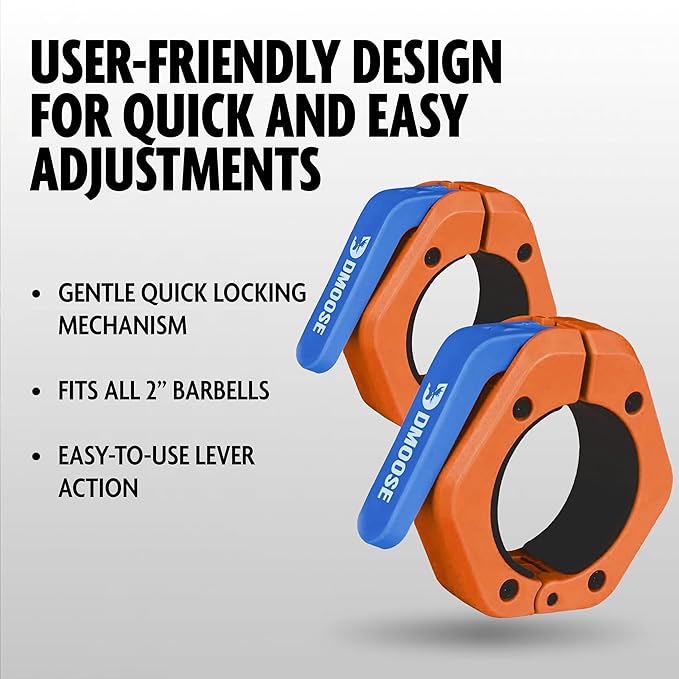 - ππππ-π πππππππ ππππππ π ππ πππππ πππππππππππ: DMoose Quick Release Clamp features a user-friendly design that fits all 2" barbells. Quickly adjust and secure your weights with ease, saving time and keeping your workout momentum strong. Ideal for both home and commercial gyms. Enjoy seamless transitions between sets with these easy-to-use weight clamps, designed for quick and efficient adjustments.