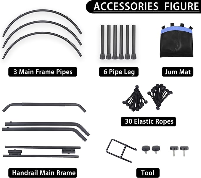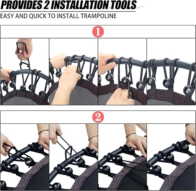 - ✅【Warm Tips】: Please read the user manual or watch the installation video before installation.Assembling the frame wasn't too difficult for this product, but attaching each bungie cord takes a significant amount of strength even with the tool provided. However, once the product is built, it is an excellent device. Very very quiet compared to the spring-loaded trampolines.