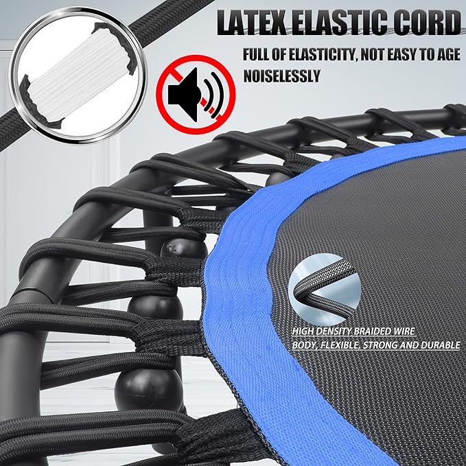 - ✅【Good Elasticity】:The bungee-rope design system with 30 thickened ropes which are 0.32"(8MM) of diameter provides joint-friendly suspension,soft but strong bounce back, provides silent and safely bounce back, reduces noise in maximum extent, affords more stability, and gives you a great jumping experience. Special tool is included for assembly.
