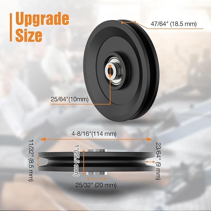 - Upgraded Size: Nylon pulley wheel diameter 114 mm(4.5 inches), Bolt Bore: 10 mm(0.39 inches), Groove Depth: 9 mm(0.35 inches). This is an upgraded pulley and the increased diameter makes it a breeze to lift heavy objects