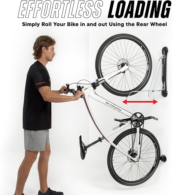 - Easy Load - Our innovative design makes lifting effortless. Simply balance your bike on its rear wheel and push it into the swivel bike wall mount for quick and easy storage.
