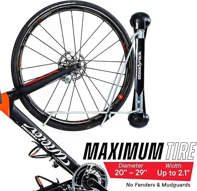 - VERSATILE STORAGE FOR MOST BIKE TYPES - Our wall mount bike rack accommodates tire widths up to 2.1 inches and wheel diameters between 20 and 29 inches, making it suitable for most bike types.