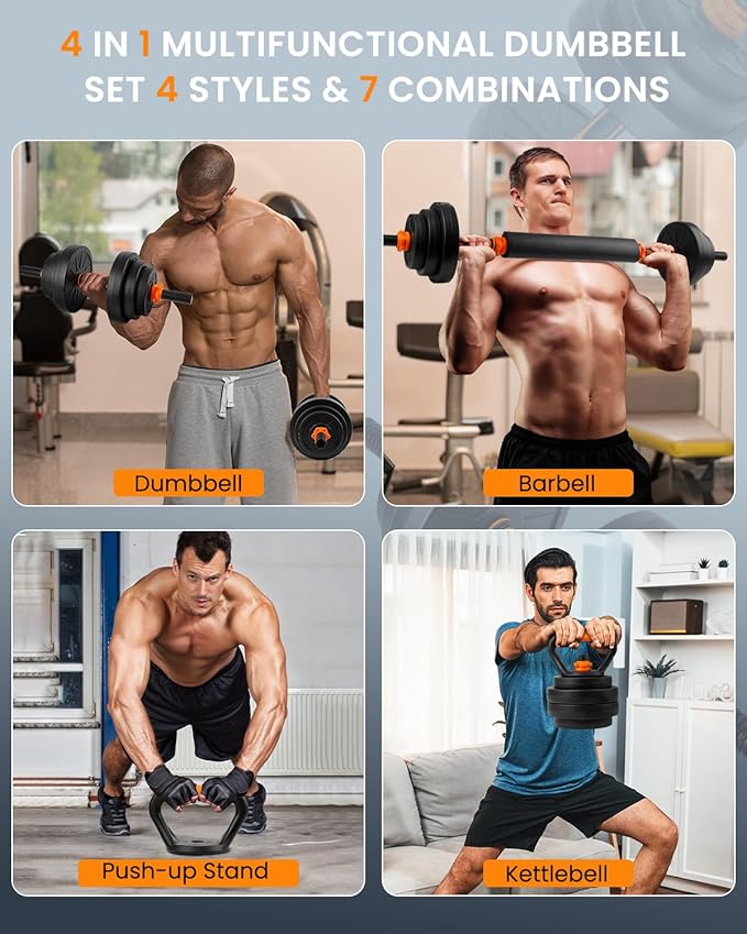 - 【4 in 1 MULTIFUNCTIONAL DUMBBELL SET】With The Fragraim weights dumbbells set, you can get a pair of dumbbells also barbells, kettlebells and push-up stands, which help you do many exercises including bench presses, squats. A complete set of dumbbells perfect for presenting the home gym workout