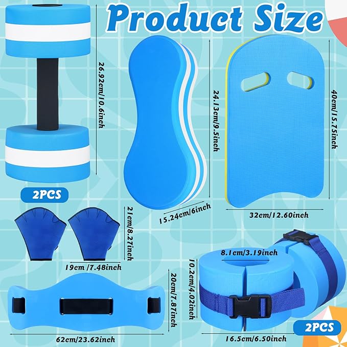 - Comprehensive Full Body Workout: the aquatic exercise set includes 2 cuffs, 2 water sports dumbbells, 1 swim strap, 1 swim float, 1 pull buoy, and 2 exercise gloves for a complete aquatic workout; Improve your overall health through a comprehensive workout that targets your upper body, lower back, and more