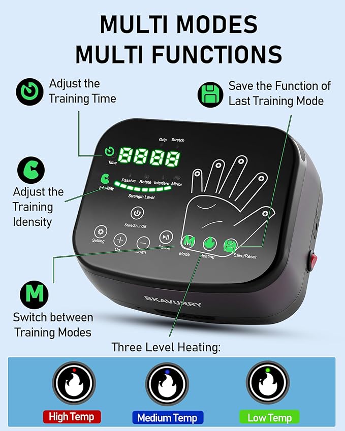 - 【Customized Adjustment】The Rehabilitation Glove has 4 training modes (Passive/Rotate/Mirror/Anti-interference), 3 levels of heating temperature and 8 levels of training intensity, which can better meet different needs. The advanced anti-interference mode prevents the thumb and other fingers from interfering with each other during training, better trains the finger extension ability.