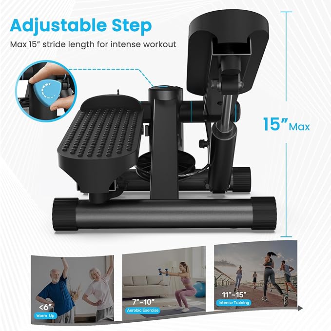 - 【ADJUSTABLE TENSION, MORE BALANCE】There is a stride adjustment knob on the front of the stepper. You can adjust the height of the steps according to your needs to work on relaxing or intense workout.